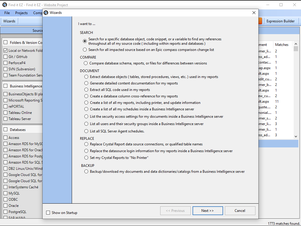 Simply import your Epic compass compare tab delimited text file to search and document all impacted databases, reports, source code across your entire library of Crystal RPT, SAP Business Objects Universes, Microsoft SQL Server or Oracle clarity database, Tableau Workbooks and Datasources ... the whole Epic internal and external references kit and caboodle.