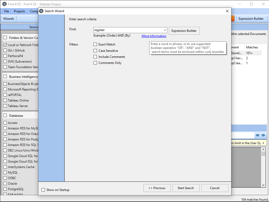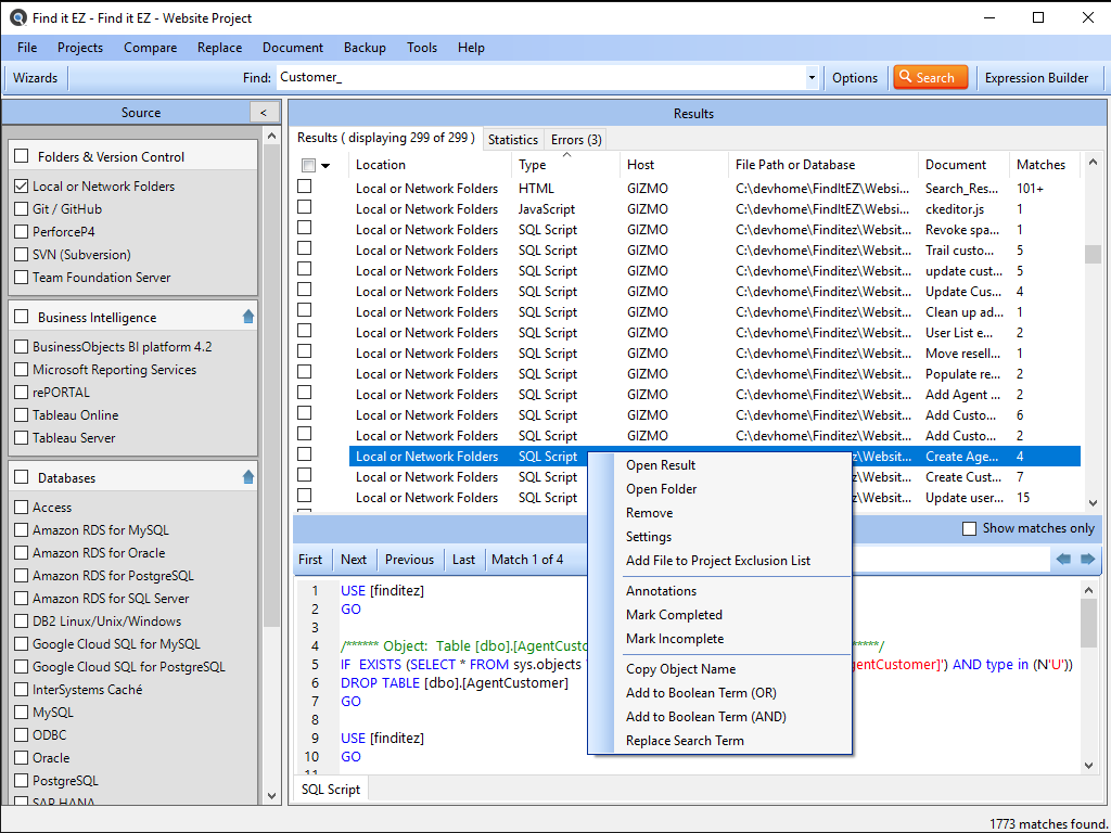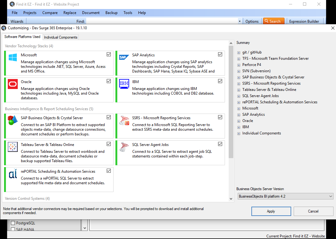 Integrated support for SAP BI Platforms and version control systems Git, SubVersion, and Team Foundation Server. Search, Compare and Document your source code stack including underlying databases Oracle, SQL Server, MySQL, DB2, PostgreSQL and more.
